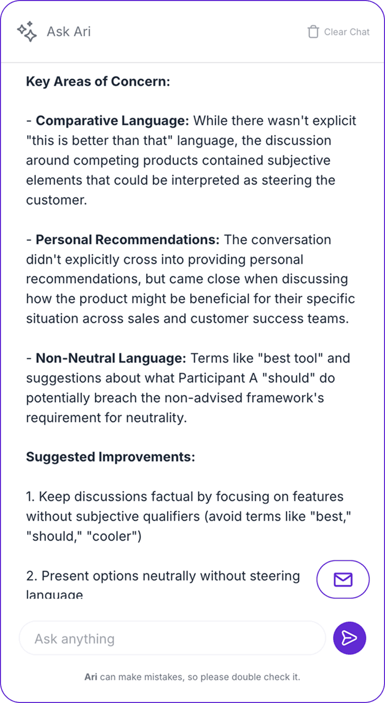 Turn compliance from a mandatory checklist into a competitive advantage, optimising conversations for both regulatory safety and positive business results.